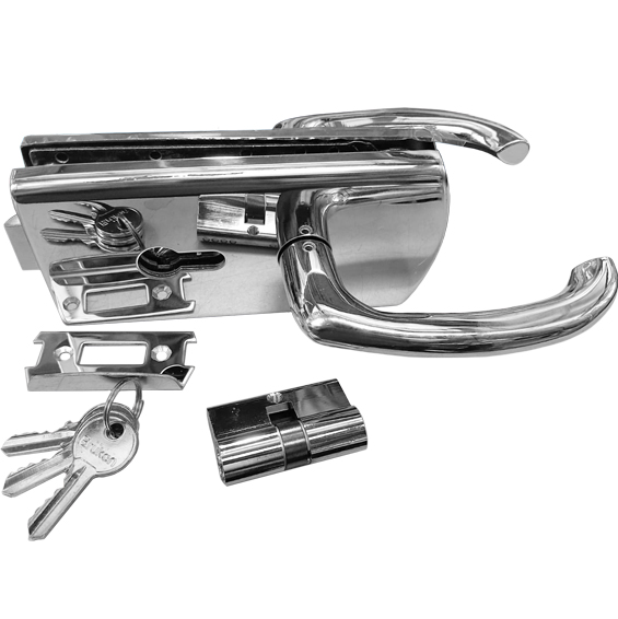 Chapa doble manija para puerta de vidrio templado en sistemas abatibles.