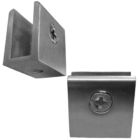 Clip para entrepaño cuadrado para vidrio fijo de 8-10 mm. Sin resaque. Material: Zamac.