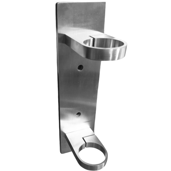 Conector base rectangular de muro a poste de barandal. Tipo abrazadera. Aplicación: para poste redondo 38 - 51 mm. Material: Acero 304. Acabado: Satín.