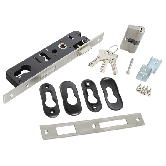 Chapa Guadalajara cuerpo interior en acero, con chapetón y contra de acero inoxidable doble manija tipo Eurovent para aluminio, las manijas( SCO37) se venden por separado.