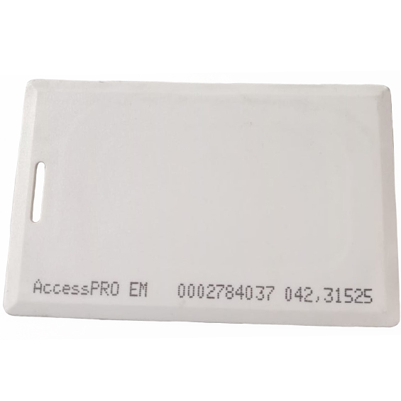 Tarjeta de proximidad gruesa 125 Khz (Tipo EM) con perforación. Formato wiegand 26 bits estándar. No imprimible.